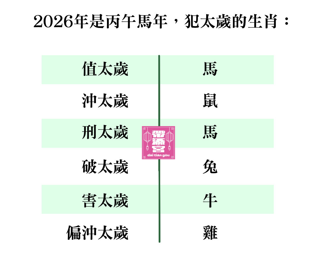 犯太歲:個人生肖與值年太歲的生肖產生「沖、刑、害」或「值太歲」的關係。