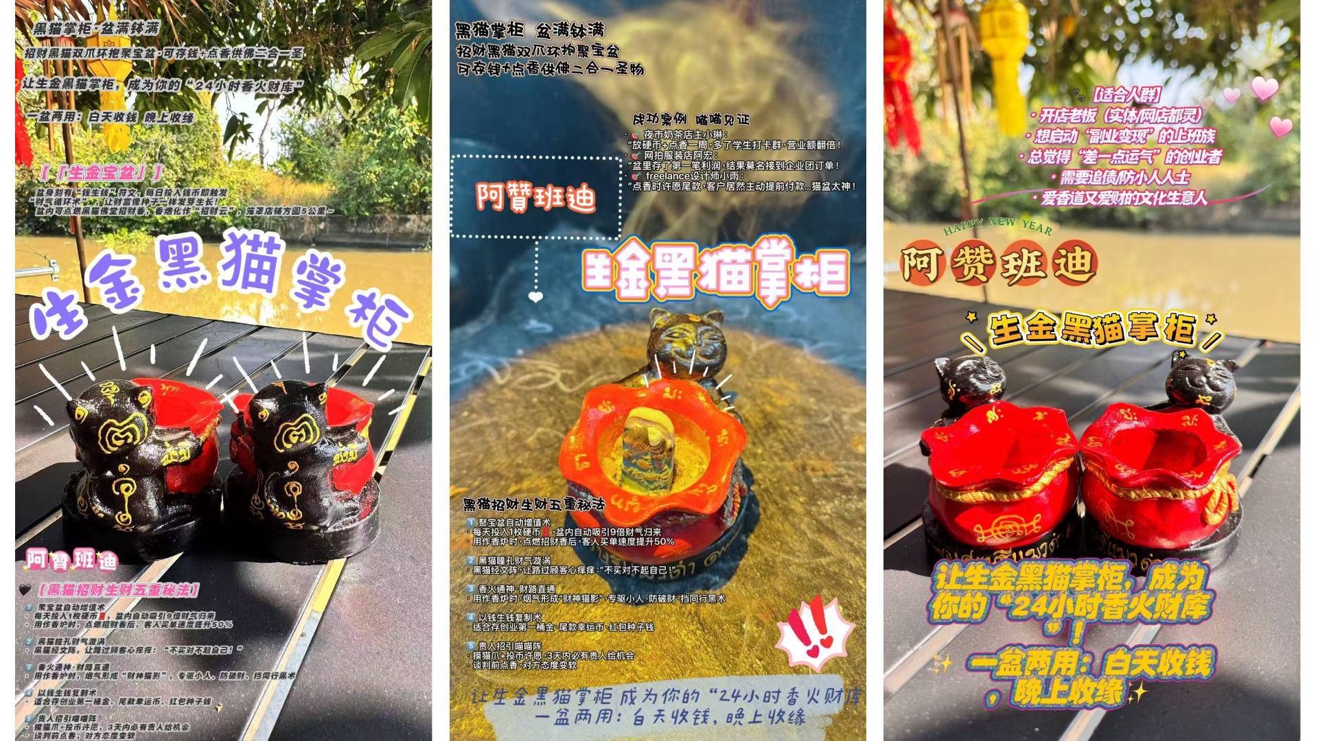 盆內可點燃黑貓冥夢轉運找財塔香,香煙畫作招財雲,壟罩店面周圍,為你招財招客招生意!
