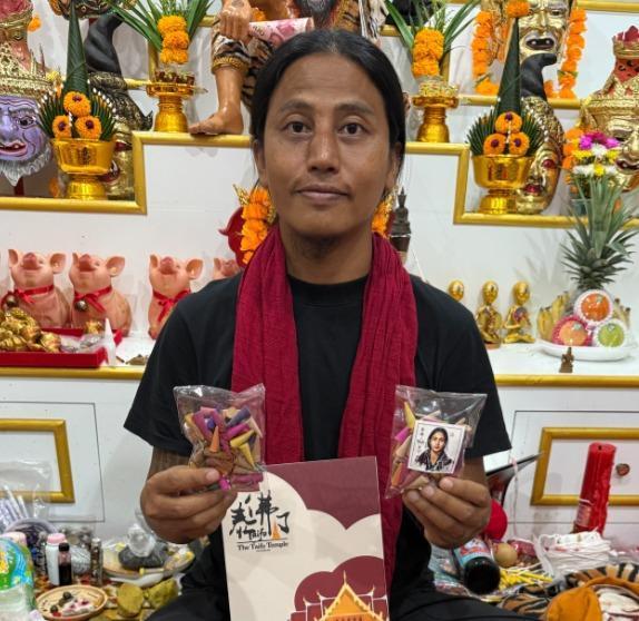 只要把寫有姓名生日及願望或受到的委屈的紙條壓在燒塔香的容器下,